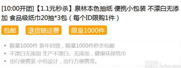 天猫旗舰店特价1.1元,10点开抢,限量1000件,还直接包邮喔,价格实惠,这款纸巾不漂白无添加,健康又环保,喜欢的盆友可以蹲点准备啦~