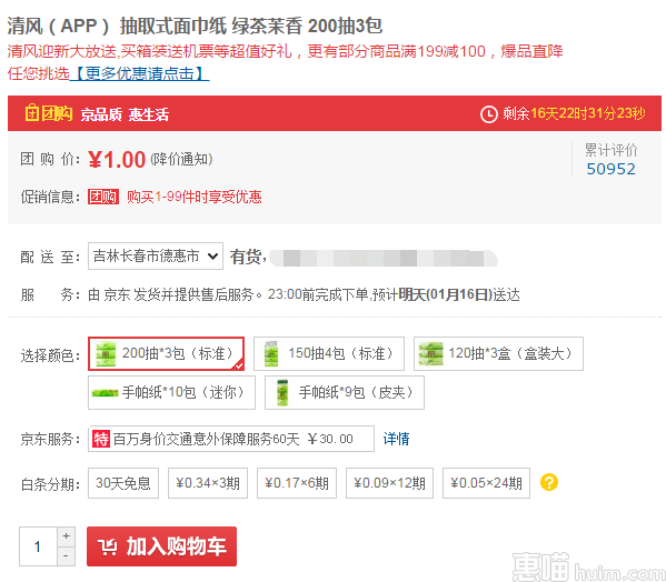 清风(APP) 抽取式面巾纸 绿茶茉香 200抽3包,京东目前特价1元,可买99件,手慢无!