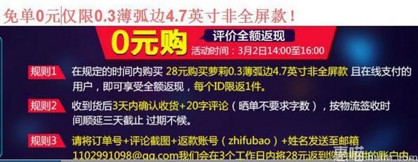 如何返现:收货后3天内确认收货+20字数评价,然后把订单号和评价截图以及支付宝的返款帐号+姓名发给到邮箱:1102991098@qq.com,在3天内即可收到返款,这家的活动惠喵之前推荐过手机壳,还是靠谱的,不明白的可以咨询该店铺客服。