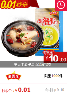 秒杀预告# 史云生 清鸡高汤11g*2支 13点 0.01元包邮