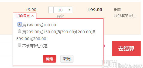 注:由于同时参加2个促销活动,记得在购物车页面修改优惠选项为:199-100,如下图所示;