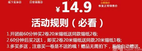聚划算10点开启14.9元,前60分钟下单的朋友享受买1送1的活动,14.9到手2卷,对于热爱烘焙的朋友来说这个是必备的了;