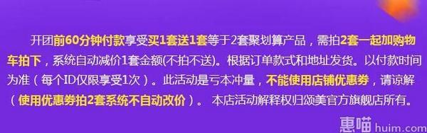 聚划算10点开启65元,前60分钟拍下付款的朋友可享受买1送1的活动,也就是65元到手2套,有情侣款可选哦,拍下2套系统自动改价,需要的朋友快和ta一人一套吧~