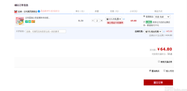 聚划算特价34.9元包邮,下单两件,领取店铺5元优惠券,实付64.8元,折合单件32.4元,价格不错哦~