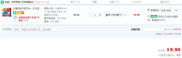 天猫药房现价39.9元,可领取30元优惠券,下单实付9.9元包邮。