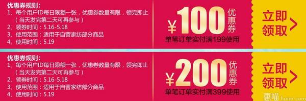 京东目前可领取自营家纺满199-100/满399-200元东券,力度都是非常给力的,全平台可用,用于购买自营家纺指定部分商品;仅限2016.5.19日当天使用,大家先领券防身吧!