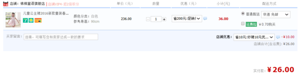 天猫旗舰店现价36元,可领取10元优惠券,下单实付26元包邮,共多种款式可选,六一快到了,赶紧给家里的小公举添件萌萌的公主裙吧!