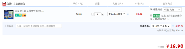 天猫现价29.9元,可领取10元优惠券,下单实付19.9元包邮,折6.6元/支。