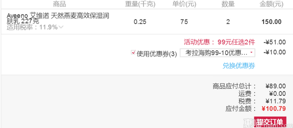 考拉海购售价75元,下单2件,参加99选2件活动,还可以叠加使用惠喵推荐的99-10券,税后实付100.7元包邮,折合单件50.元,好价啦,喜欢的妈咪们可以入手咯!