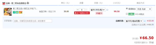 天猫售价99.5元,下单立减30元,喵友们还可以领取3元优惠券,券后实付66.5元包邮,价格不错呀,花生配啤酒好畅快!