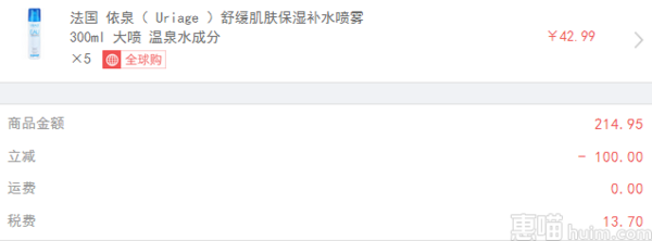 京东全球购移动端特价42.99元,可参加满198减100活动,下单5瓶,满减加税后实付128.65元,折25.7元/瓶,手慢无的小神价了,需要的赶快入手。