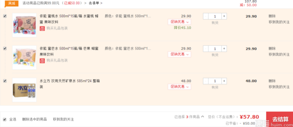 这三款饮料都参加满99-50活动,下单满减后实付57.8元,到手30瓶苏打水,24瓶矿泉水,非常便宜了。日常单纯两箱苏打水就要在60元左右,手慢无啦!