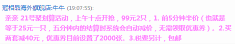 聚划算10点特价99元,前5分钟拍下立减49.5元,折25元/只,不过有税费,需要另计哦~