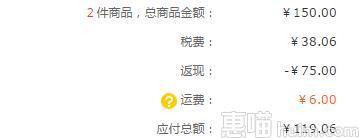 京东全球购售价75元,下单2件,参加满2件5折活动,加上38.06元税费,实付113.06元,折合单件56.53元,近期好价哟,喜欢的喵友可以入手咯!