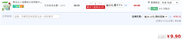 天猫商城售价69元,拍下立减59.1元,实付9.9元包邮啦~折合单片2.4元,价格不错啦,喜欢的喵友可以入手咯~