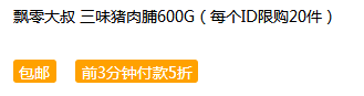 聚划算售价39.8元,前3分钟拍下付款的喵友还可以享受半价优惠,拍下系统自动改价,实付19.9元包邮,好价啦,吃货们放开荷包快快入手吧!