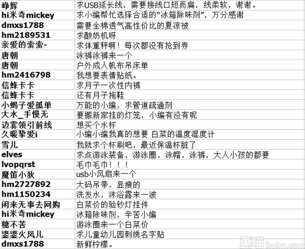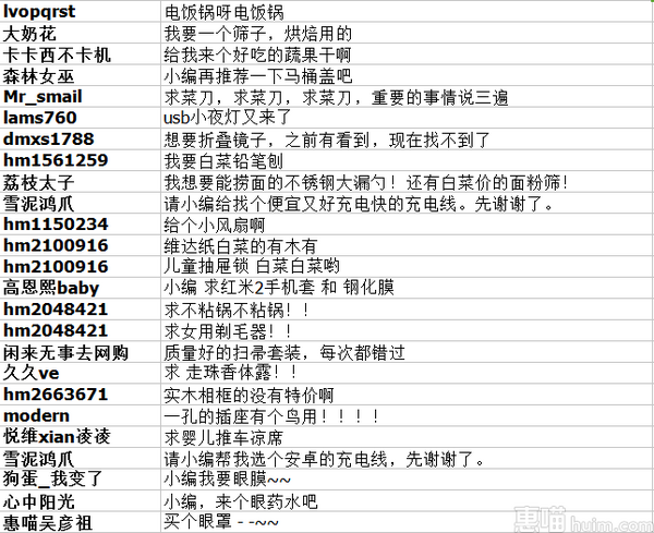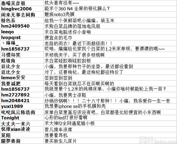 为了让大家买到更优质的白菜,请爆料高销量、评分好的白菜,这样通过率会高一些呢~也欢迎大家爆料上面的这些白菜,发挥群众的力量,互帮互助~一起建设有爱的惠喵大家庭哟~!