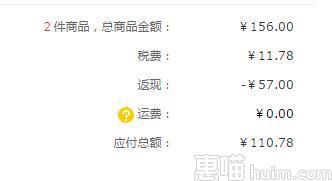 京东全球购售价78元,下单2件,参加99元选2件活动,加上11.78元税费,实付110.78元包邮,折合单件55.39元,