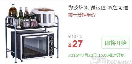 天猫旗舰店15点淘抢购售价27元,前10分钟拍下付款的喵友还可以享受半价优惠,收货返现13.5元,折合实付13.5元包邮,近期好价啦,小户型需要厨房收纳架的喵友可以蹲点抢购咯~