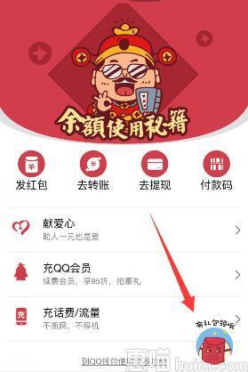 3.点击进入下方的余额使用,点击右下角的“有礼包领哦”;