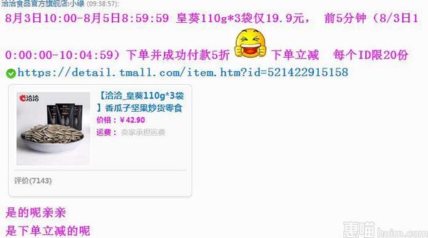 聚划算售价19.9元,前5分钟拍下付款的喵友还可以享受半价优惠哟~拍下系统自动减价,实付9.95元包邮啦,好价哟,吃货们快上!