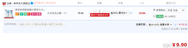 天猫旗舰店29元在售,拍下立减19.1元,实付9.9元包邮到手,京东同款还需69元,差了不少,韩束的品质也很不错,推荐多次。