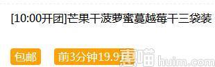 聚划算10点特价25.9元,前3分钟拍下立减6元,下单实付19.9元包邮,含芒果干120g+菠萝蜜40g+蔓越莓干100g,果肉细腻,甘甜可口,每一口都原生态好滋味~