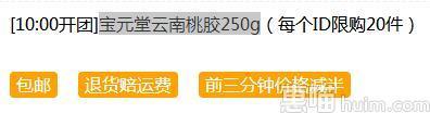 聚划算10点特价38元,前3分钟拍下立减19元,下单实付19元包邮,规格250g,桃胶美容养颜的功效很好,做成桃胶西米露或者跟银耳一起煮银耳汤也不错~