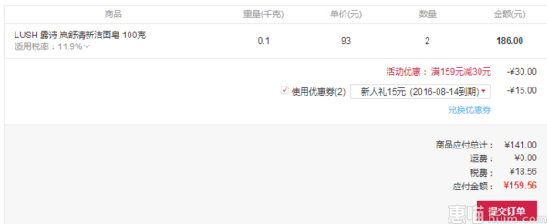 考拉海购特价93元,下单2件,可参加满159-30活动,同时还能领取15元无门槛券,加上18.56元税费,实付159.56元包邮到手,折后每件79.78元。需要的妹子入手啦~