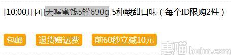 聚划算10点特价39.9元,前1分钟拍下立减10元,下单实付29.9元包邮,含韩话梅+加应子+盐津桃肉+盐津葡萄+西梅,合计5罐690g,果肉丰厚,酸中带甜,每一罐都别有滋味~
