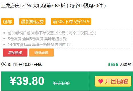 天猫旗舰店目前39.8元在售,10点开始,前30秒拍下直接半价,拍下直接改价,实付19.9元包邮到手,将近2.5斤,价格很棒呀,吃货们上!
