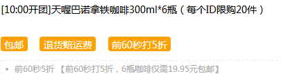 前60秒半价# 天喔巴诺拿铁咖啡300ml*6瓶 19.9元包邮(39.9-20)