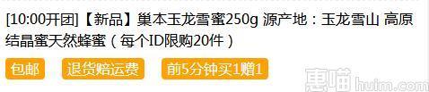 天猫聚划算10点开启29.9元,前5分钟享受买1送1的优惠,也就是一共到手500g,价格不错啦!高原生态蜜,健康美味!
