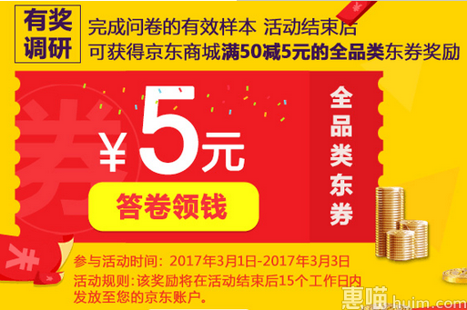 参与京东问券调查,即可领取5元京东全品类优惠券,满50元立减5元优惠!