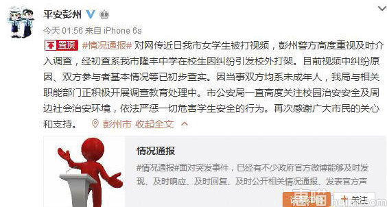 对网传近日我市女学生被打视频,彭州警方高度重视及时介入调查,经初查系我市隆丰中学在校生因纠纷引发校外打架。目前视频中纠纷原因、双方参与者基本情况等已初步查实。因当事双方均系未成年人,我局与相关职能部门正积极开展调查教育处理中。市公安局一直高度关注校园治安安全及周边社会治安环境,依法严惩一切危害学生安全的行为。再次感谢广大市民的关心和支持。