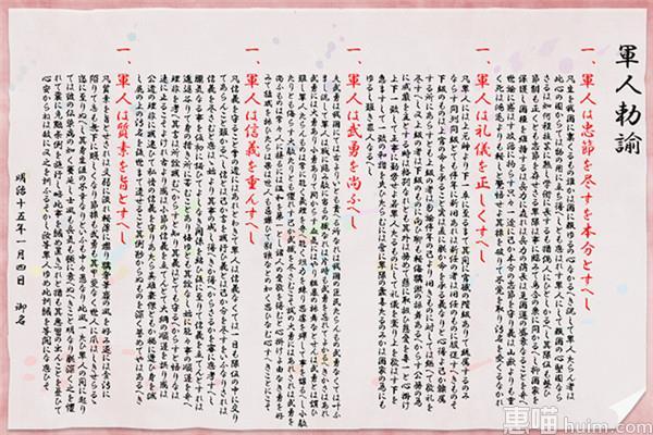 《教育勅语》是明治政府以来日本学校的基本教育方针,与《军人勅谕》一道,构成战前日本军国主义教育的两大“神器”,核心精神是给全体国民尤其是军人洗脑,灌输誓死效忠天皇的“皇国思想”。