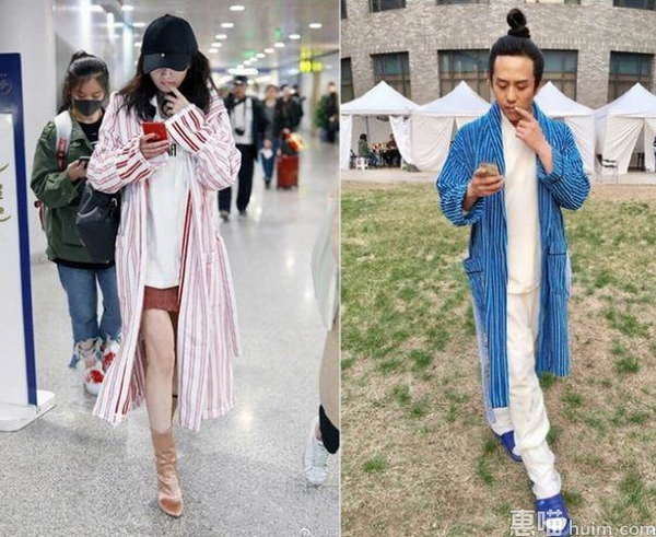 邓超3日在微博分享杨幂的机场照和自己神复制的画面对比,只见他顶着古装包子头,身穿蓝色条纹睡袍,还搞笑学对方一边滑手机、一手放在嘴上的动作,模仿地十分到位,并刻意标注杨幂来看。