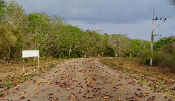 这是上亿只螃蟹组成的大军,春雨促使他们展开大迁徙这。对于这些螃蟹来说,这样的旅程算是一场“长征”,但对于当地人来说不仅算是一场奇特的景色,更是一个不小的麻烦。每逢日出日落,这种红黑黄相间的螃蟹便如同百万大军一样,横穿路面。