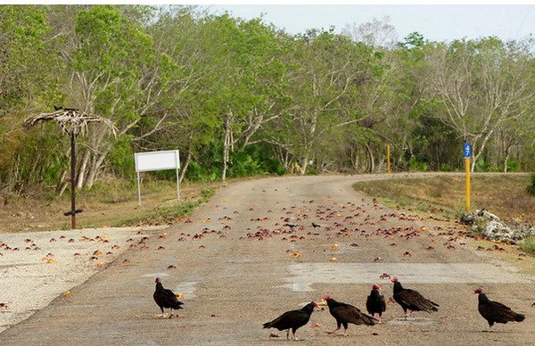 这也给司机们带来了困扰,蟹群横穿公路时被一辆汽车吓到,纷纷对汽车扬起了双螯,不服来战。螳臂当局的结果就是,不少螃蟹命丧车轮,成为秃鹰的美餐。夜色之下,不少螃蟹被过往车辆碾碎,空气中迷漫着一股死螃蟹的腐臭味。但如果你无视他们的存在,那你的车轮将会被砸破。