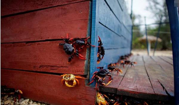 近日,古巴猪湾被数以百万计的螃蟹大军“占领”,数以百万计的螃蟹大军涌向海边产卵,岸边的岩石几乎被螃蟹覆盖。这些古巴陆地蟹,过去的11个月都生活在雨林里,每年春季第一场雨后,这些螃蟹便从附近的森林中爬出,到海边繁衍后代。