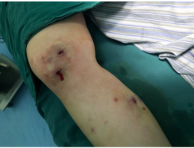 3月下旬,顾小姐与朋友结伴去巴西旅行,在亚马逊热带丛林徒步游玩。一日午后,在探险中她们来到了一条河边,周围很多小飞虫嗡嗡团作在一起。一行人徒步慢行,她突然觉得小腿上一阵刺痛。低头才发现有一只花生大小的虫子正在叮她的腿,她急忙用手中的衣物驱赶。好不容易从河边离开,顾小姐发现自己的小腿上被虫子叮咬了几个疹块,瘙痒难忍。一阵抓挠之后,又喷了点花露水,瘙痒才慢慢止住。回到酒店后,顾小姐自觉疹块不痛也不痒,所以就没放在心上,继续和朋友游玩了几个国家。