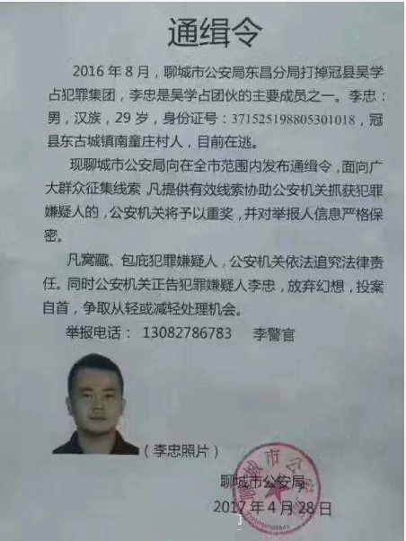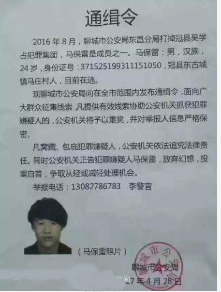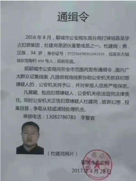 通缉令内容显示,2016年8月,聊城市公安局东昌分局打掉冠县吴学占犯罪集团。