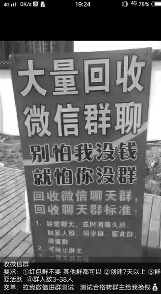 “高价回收微信群,要求:1.红包群不要,其他群都可以;2.创建时间7天以上;3.群要活跃;4.群人数3-38人。”日前在多个QQ群里,都出现了这样一种广告。发帖人称需要大量收购微信群,价格从10元到100元不等。买家称,他们比较偏好经常聊天且建群时间久的群,比如家人群、同学群、室友群、闺蜜群等都是“优质群”。