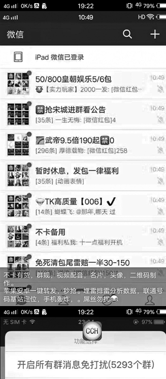 这些特别容易被封禁的不卡群,到底被用来做什么了呢?一张被出售后不卡群的截图似乎可以透露出端倪。“50/800皇朝娱乐5/6包”、“武帝9.5倍190起”、“免死清包尾雷赔一半30-150”……这些群就是此前的同学群、家族群被卖出后的新名称。