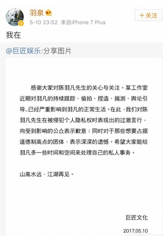 陈羽凡公司发文,已经严重影响正常生活,在5月10号的时候,卓伟曝光陈羽凡买醉砸车的视频,在视频之中陈羽凡更是爆出了自己离婚的内幕,承认自己被带绿帽子的事实。联想到在白百合出轨事情爆发之后,陈羽凡说出了自己和白百何在2015年已经离婚事实,并且宣布退出娱乐圈。看样子陈羽凡应该早就知道白百何出轨的事情了,自己一直再被带绿帽子,还是和小编一起来详细了解一下吧。