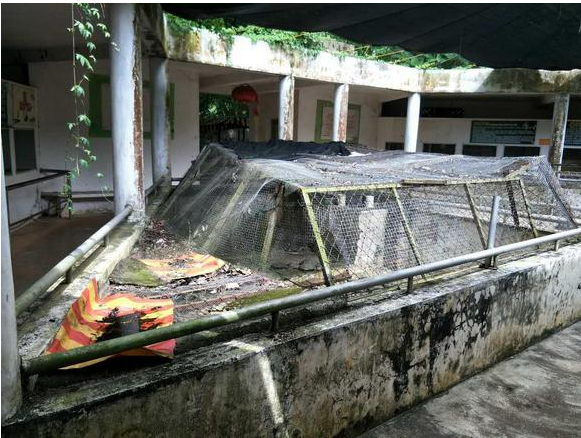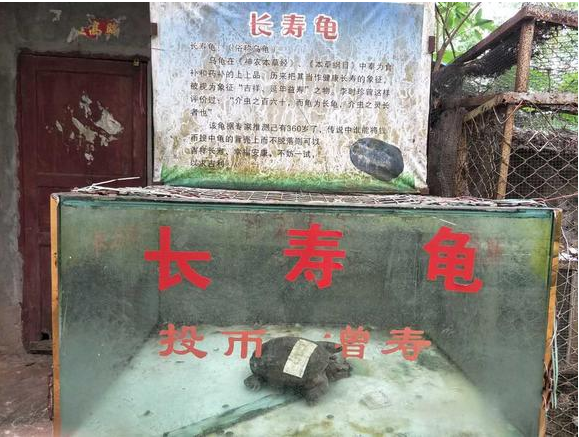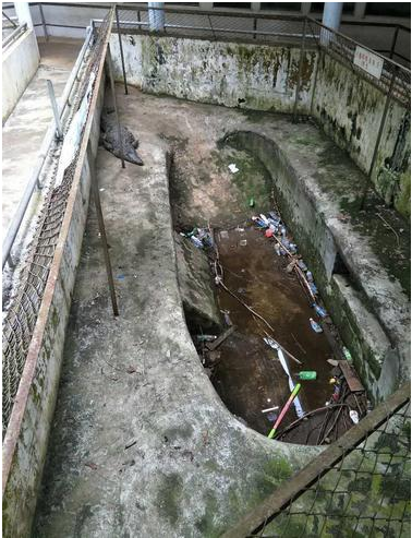 随后,记者找到了动物园内爬行馆实地走访,爬行馆内冷清的令游客感觉瘆人,进入大门有一个方形透明玻璃柜,上面写着长寿龟,箱内一只龟背上还有游客投下的纸币,从纸帀上沾的泥水以及箱子边上的布满泥污的海报来看,似乎很长时间没有人过问。院内一处尼罗鳄池内,积满了被游客扔的饮料瓶子和树枝等杂物;养龟的池子里同样都是杂物,池子里墨绿色的水如同浆糊,池了上方加盖的钢丝网上,堆积了很多枯枝和杂物。