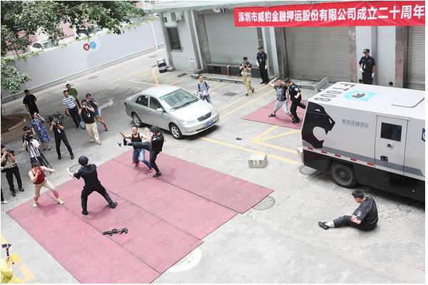 别担心,这不是突发新闻,而是威豹押运5月17日在福田营业部一楼大院进行的反抢演练。经过高度训练的威豹押运员迅速制服歹徒,成功完成押运任务。据介绍,威豹押运为押运途中可能面对的问题都准备了预案,所有押运车辆都安装了车载网络视频系统,能够实现车辆GPS定位和全程可视化监控。