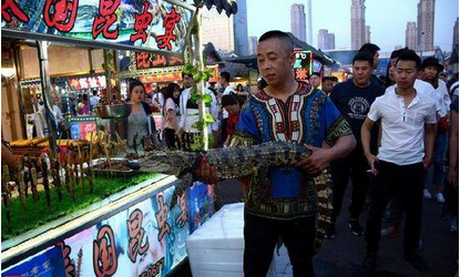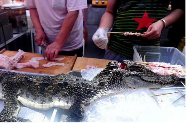 近日,一家鳄鱼店的图片在网上热传。图说显示,沈阳夜市的一家烧烤摊上,“冷血杀手”鳄鱼成为市民的盘中餐。店主告诉澎湃新闻,鳄鱼是通过合法手续购得,20元一串,生意好的时候一晚上能卖200串。