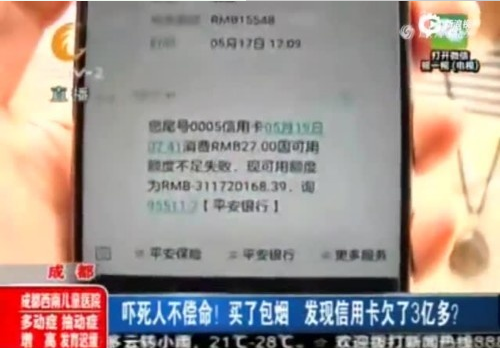 5月20日,四川成都市民吴先生出门买个烟,却收到系统提示信用卡无法继续使用,短信显示欠款311720168.39元。吴先生称,这张卡昨天还能用,不知道为何突然变成了这样……随后,吴先生连忙拨打了平安银行的24小时客服电话,“可是根本没有人接,我估计是不是中了病毒哦!”为了搞清楚事情真相,记者也来到了附近一家平安银行网点。