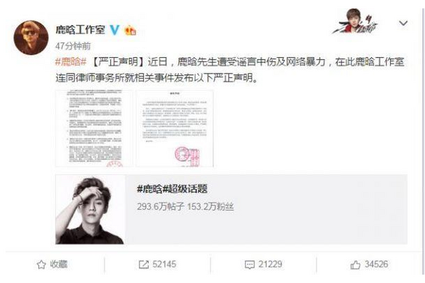 今日,鹿晗工作室发表声明,对此前遭受到的谣言中伤及网络暴力进行声明回击。